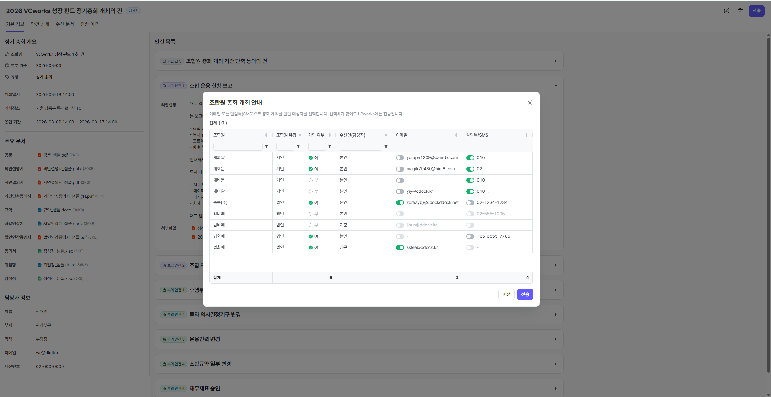 조합원에게 총회 안내를 보내려면 전송 모달을 사용합니다.