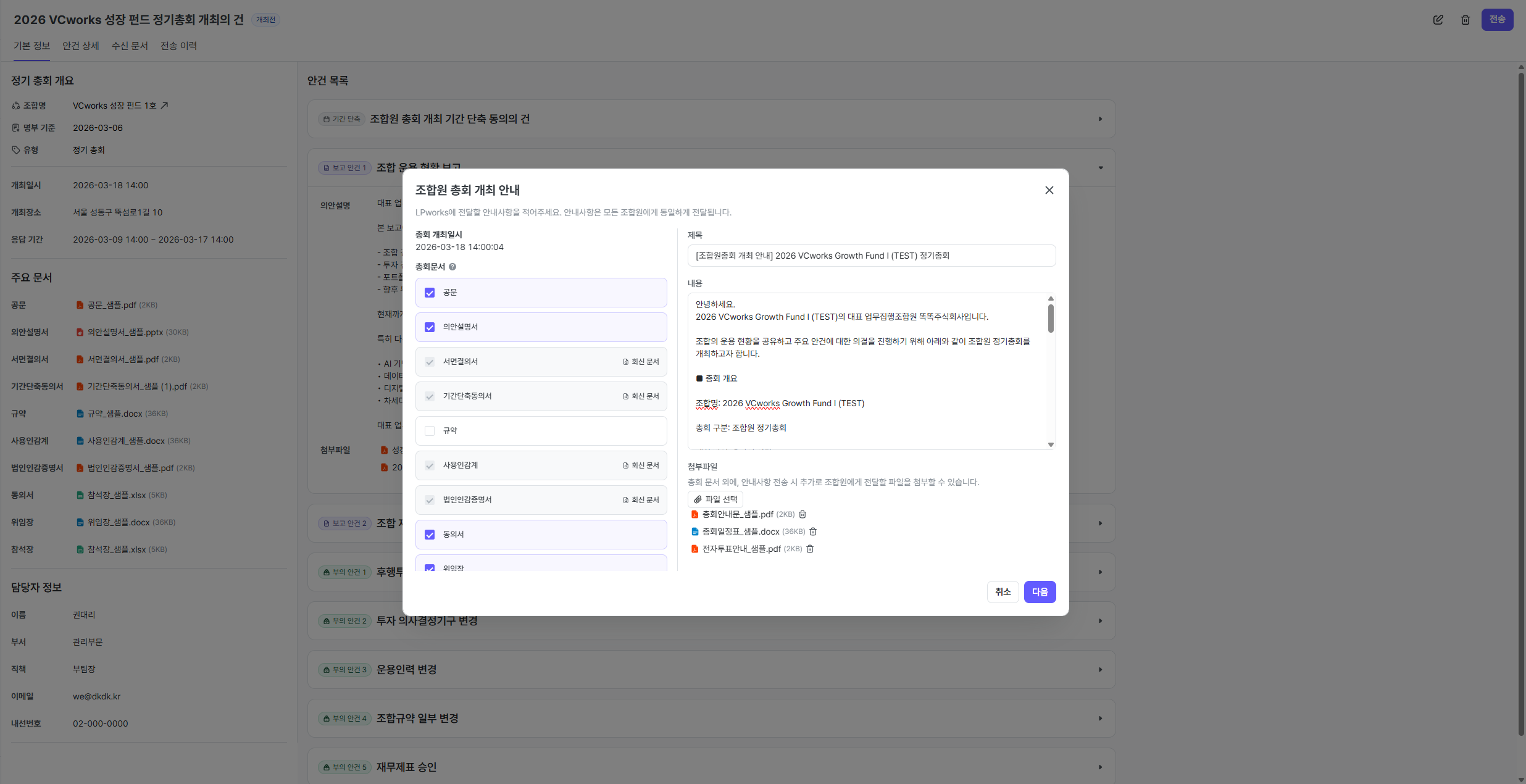 총회의 진행 상태에 따라 개최 안내, 수정, 마감일 연장, 결과 전송 등의 기능을 사용할 수 있습니다.