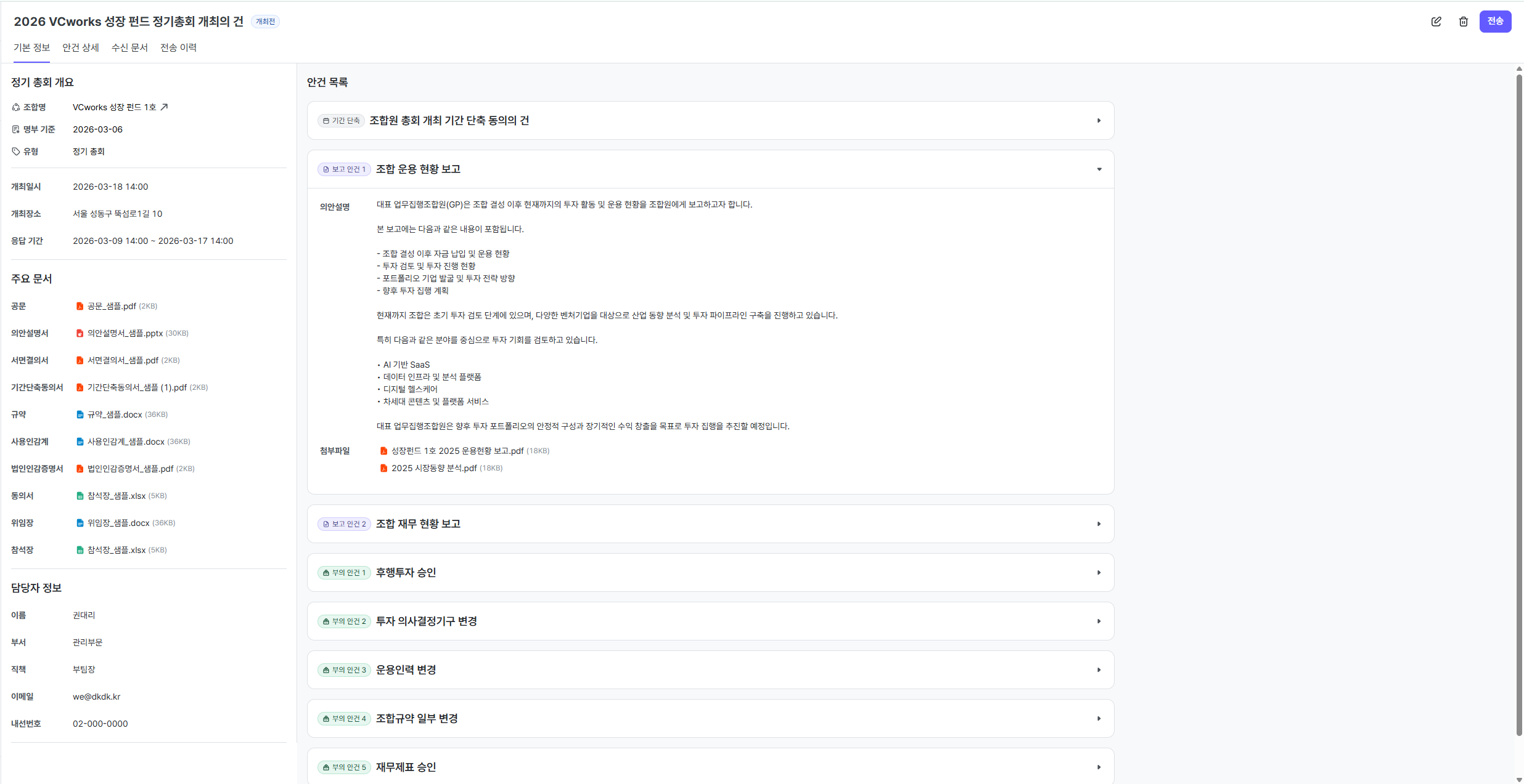 총회에 등록된 안건은 카드 형태로 정리되어 표시됩니다.