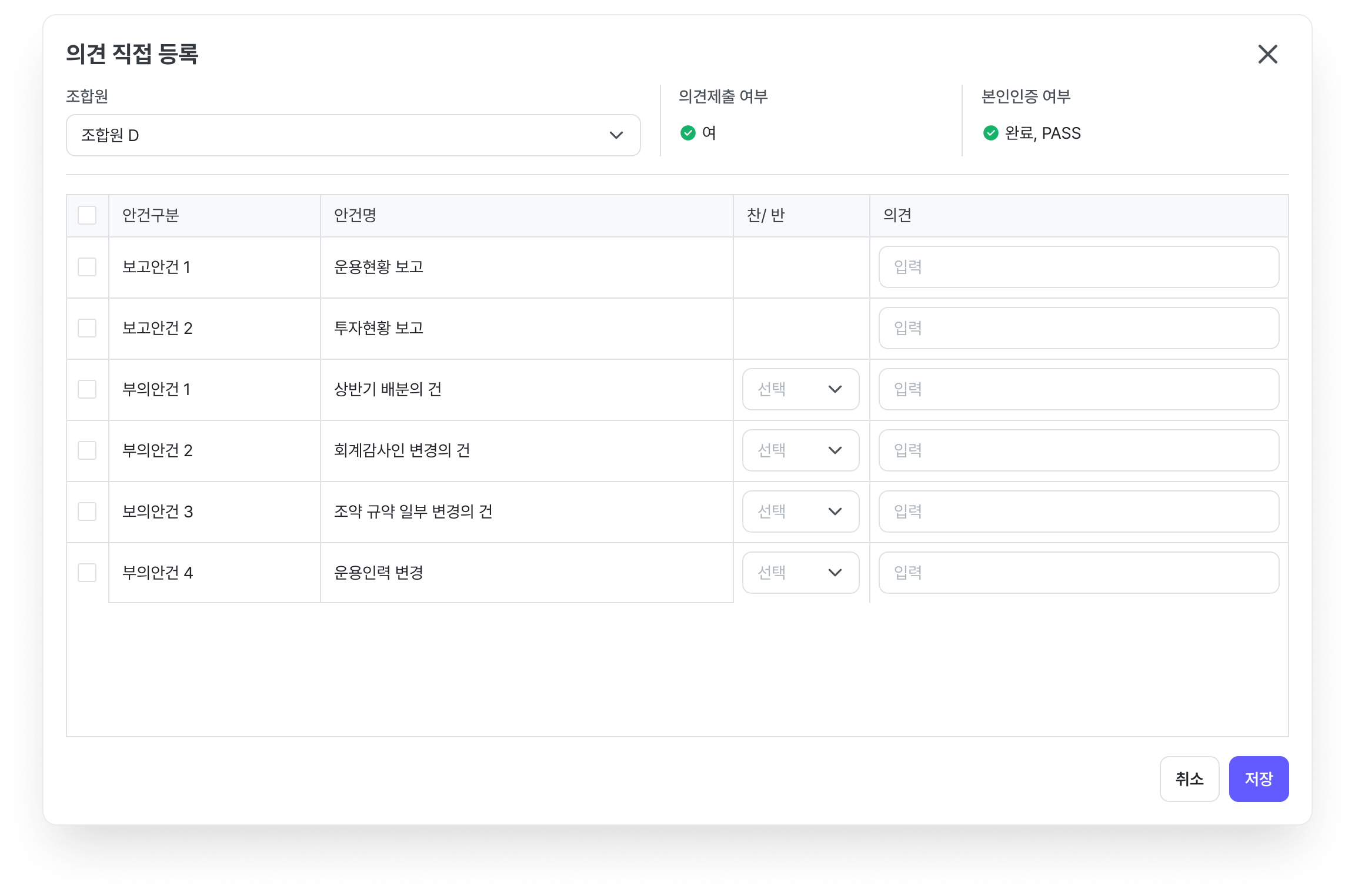 - 조합원별로 안건마다 찬성 / 반대 / 기권 및 의견을 입력할 수 있습니다.