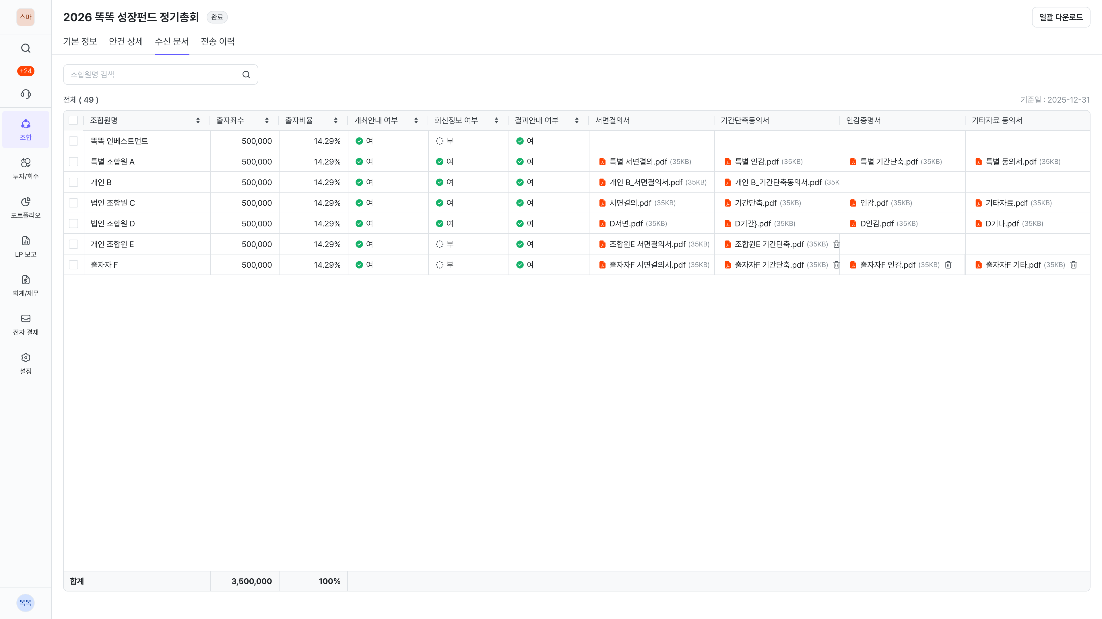 여러 조합원의 문서를 한 번에 다운로드할 수 있습니다.