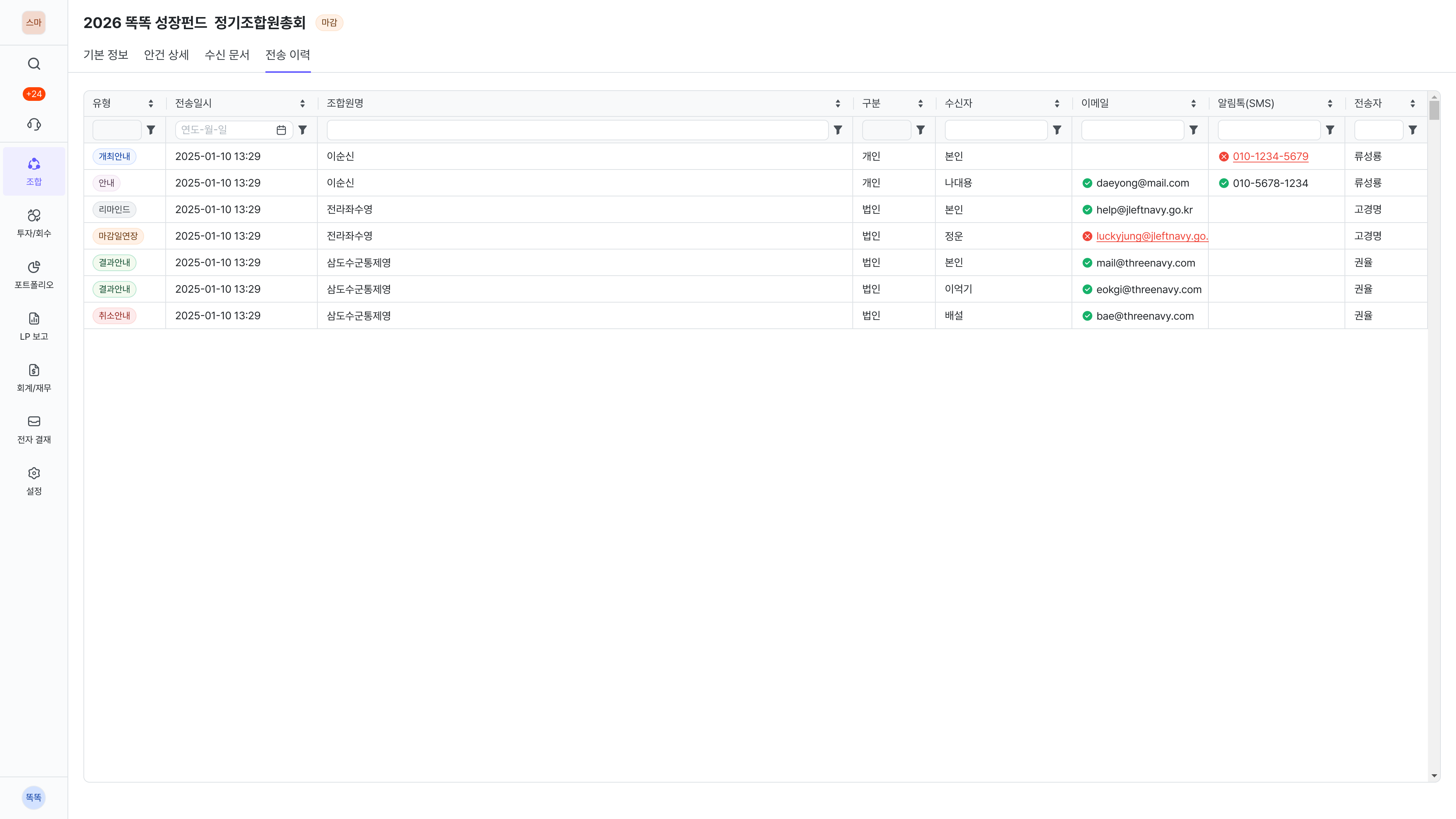 조합원총회 상세 화면의 전송이력 탭에서는 조합원에게 발송된 이메일 및 알림톡(SMS)의 전송 기록과 성공 여부를 확인할 수 있습니다.