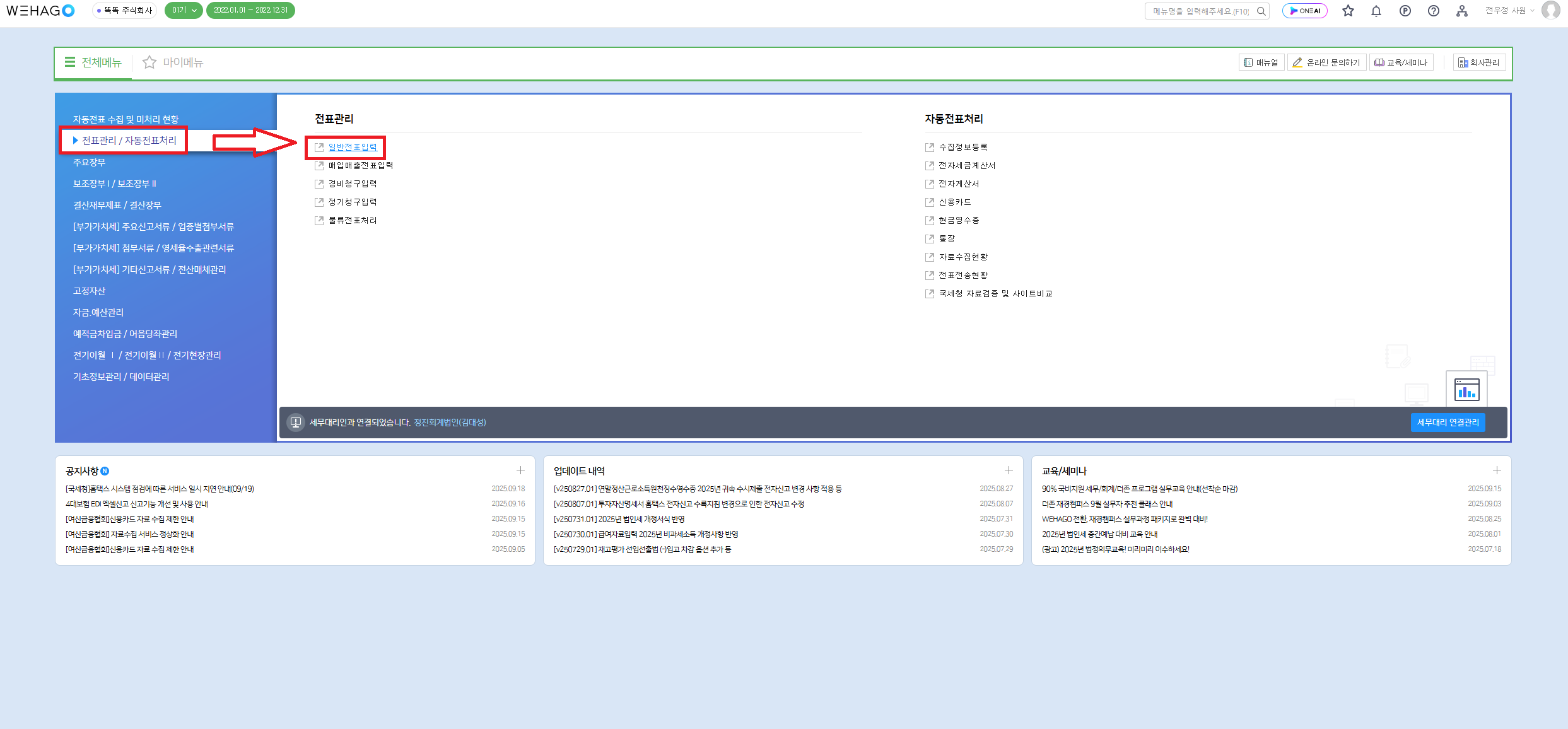 1. 로그인 후 홈 화면에서[회계/세무] 메뉴 클릭하여 이동합니다.