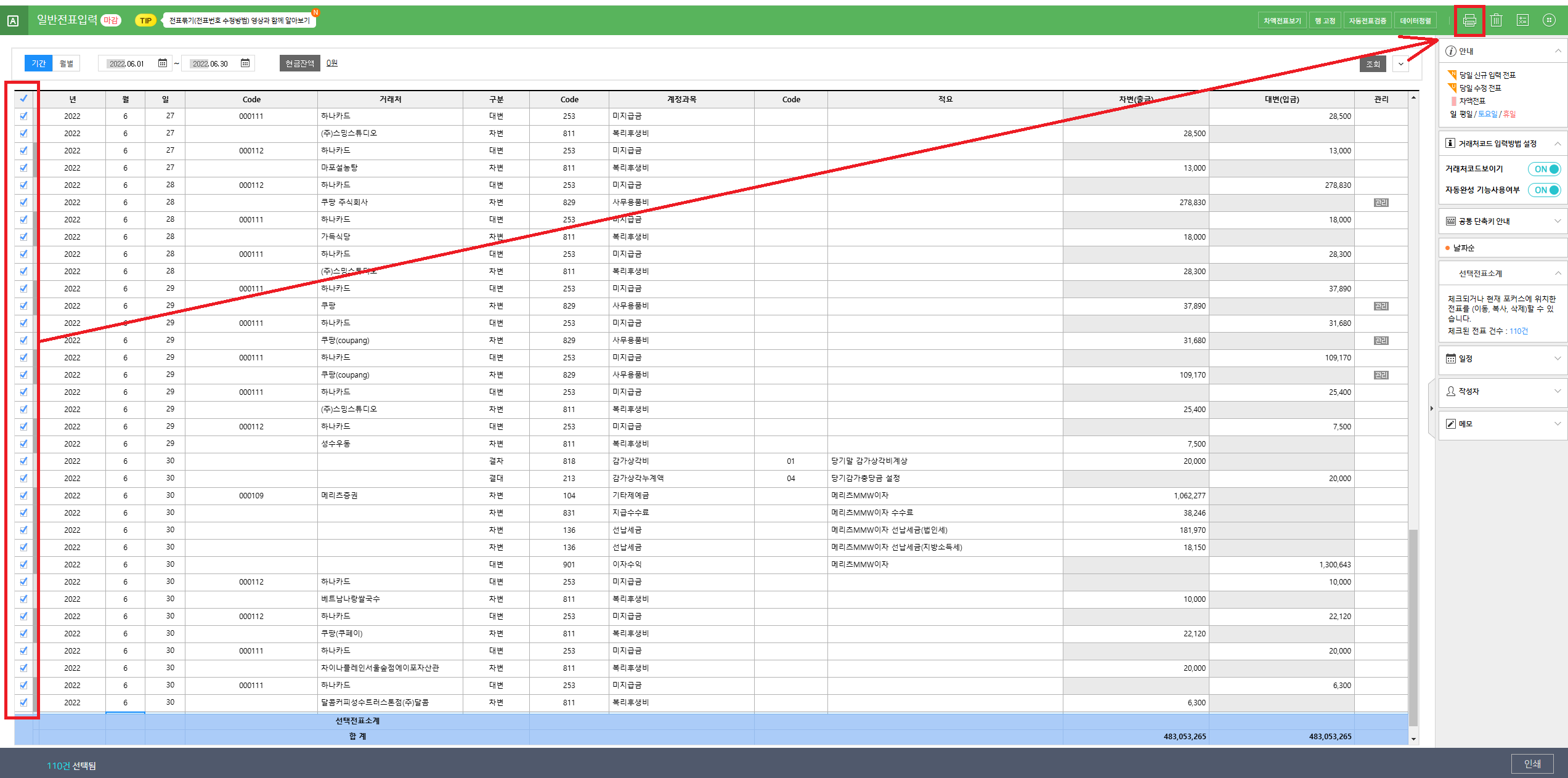 4. 조회 결과의 좌측 체크박스 입력 후, 우측 상단의 인쇄 버튼 클릭합니다.