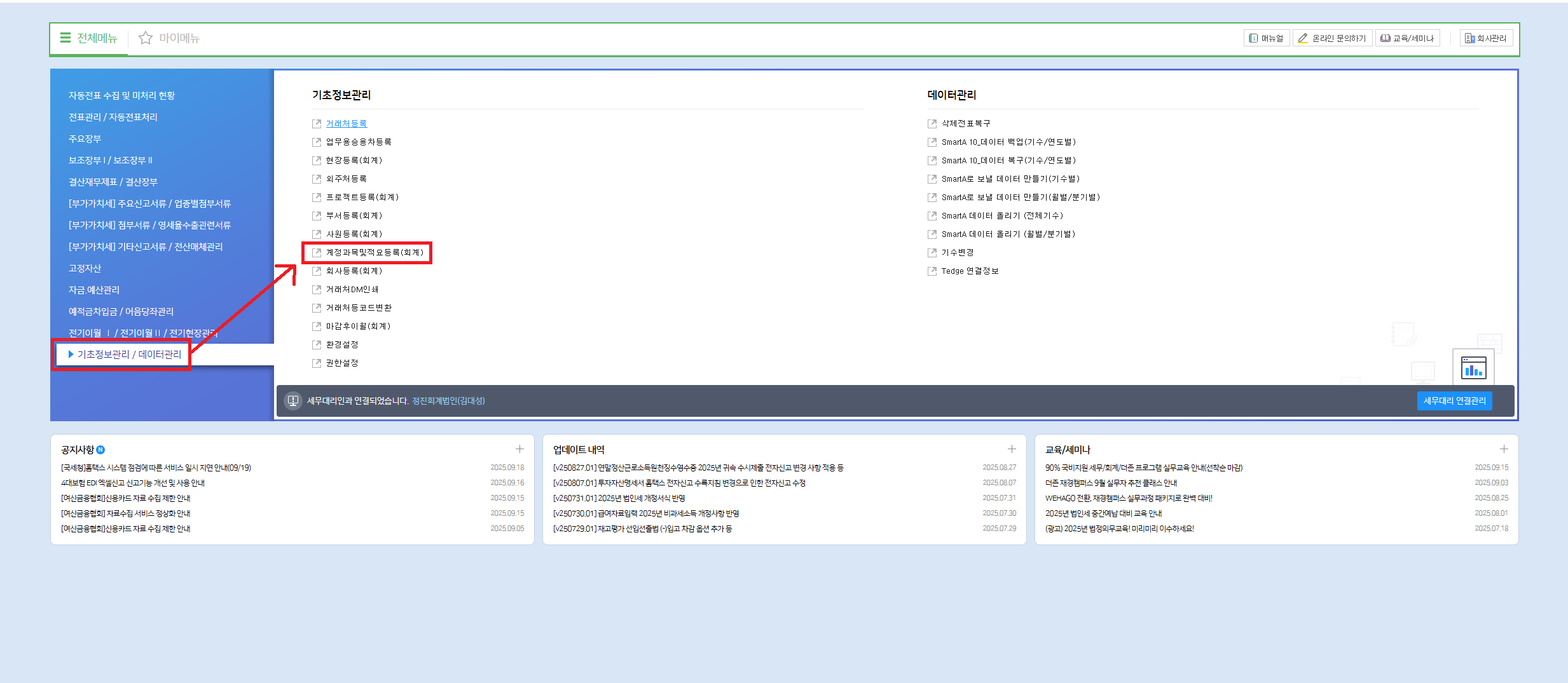 2. 좌측 메뉴에서 [기초정보관리/데이터관리] > [계정과목및적요등록(회계)] 메뉴 클릭하여 이동합니다.