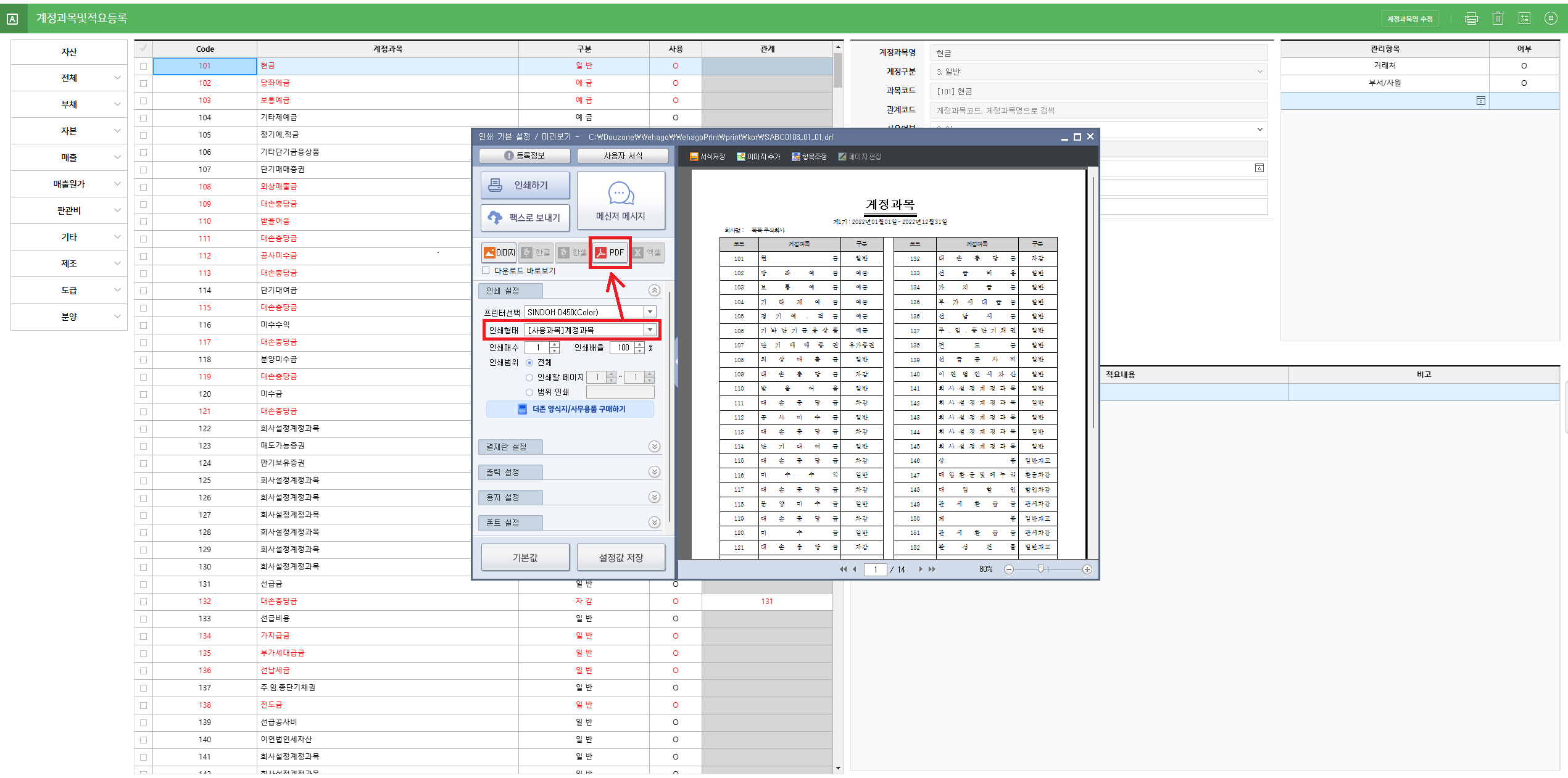 4. 출력 팝업에서 ‘인쇄 형태’의 값을 ‘[사용과목]계정과목’으로 선택 후, PDF 출력을 선택합니다.
