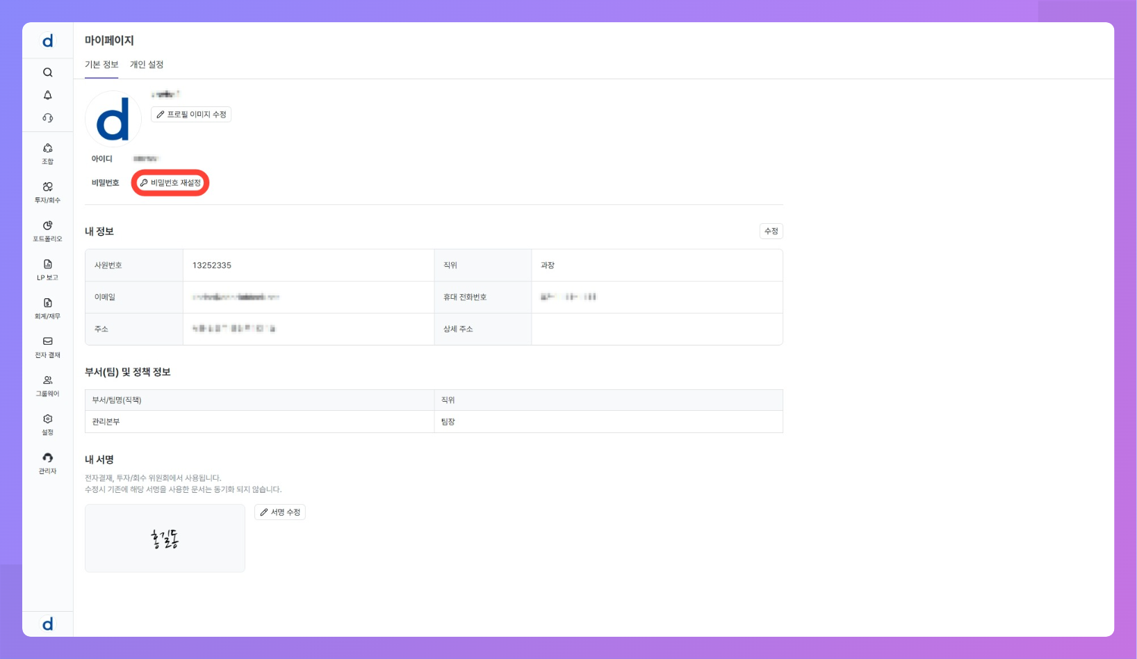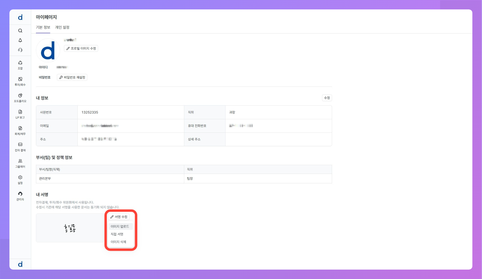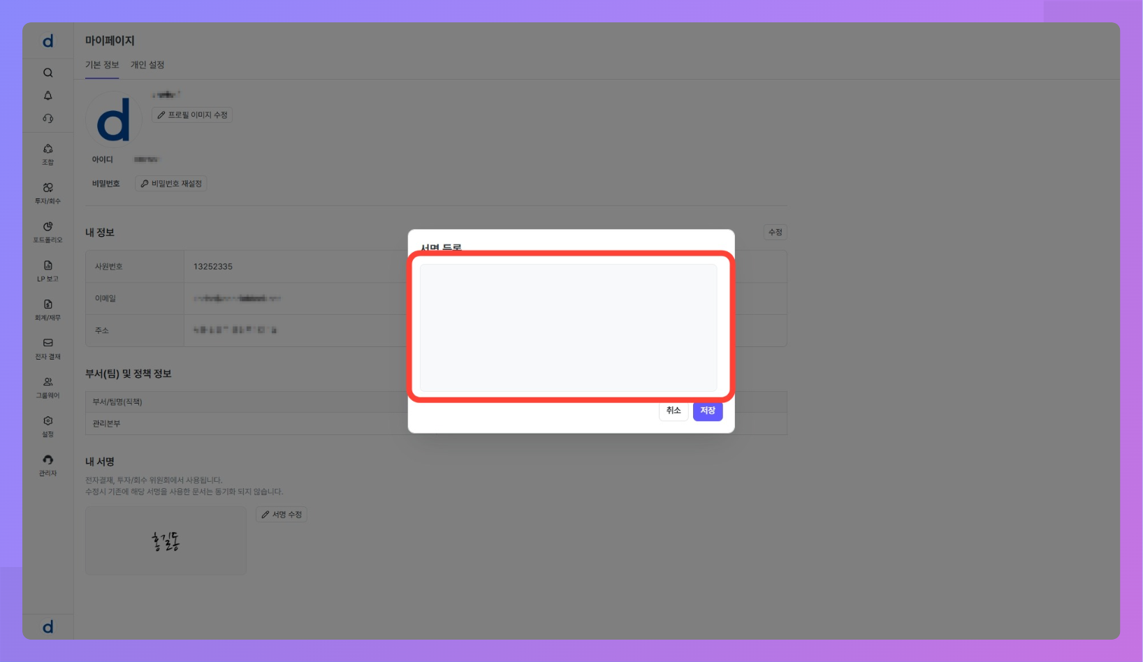 - 내 서명은 전자결재 기안·결재 승인, 투자심의 의견서 제출, 투자 운용지시서의 기안자 서명 등에 재사용됩니다.
