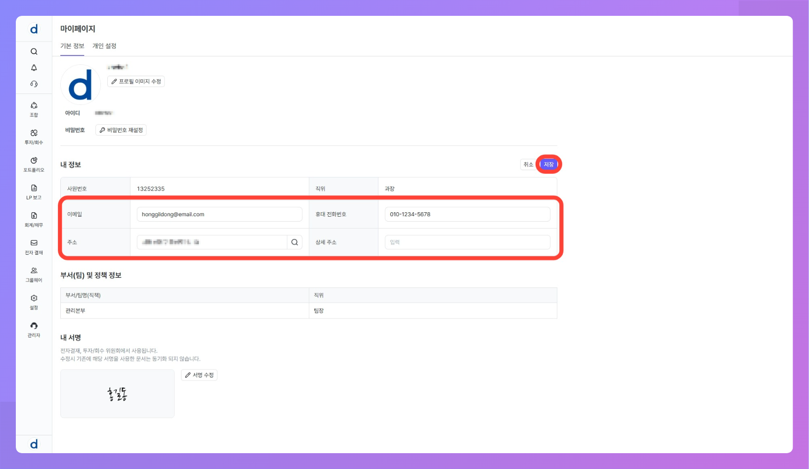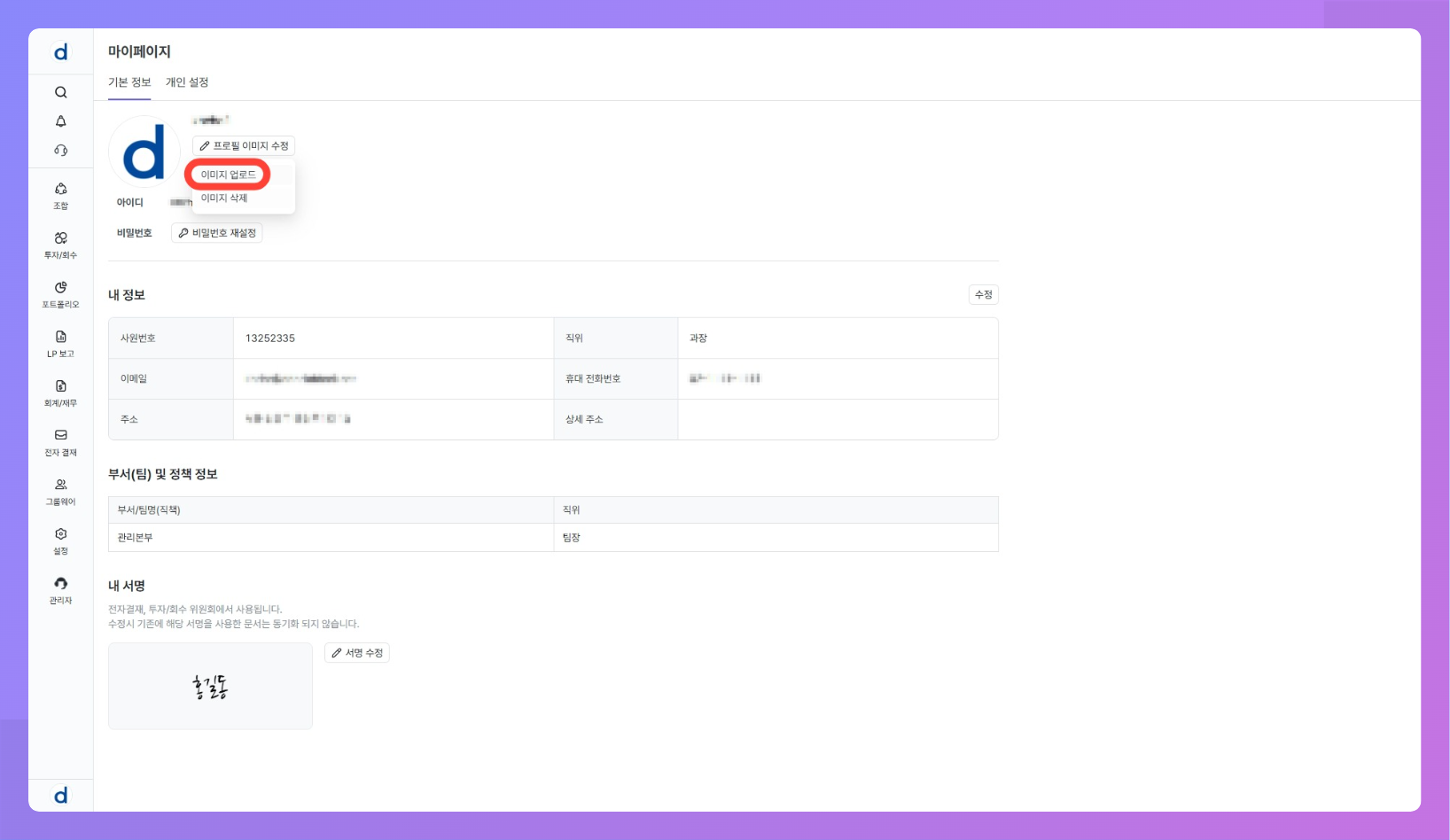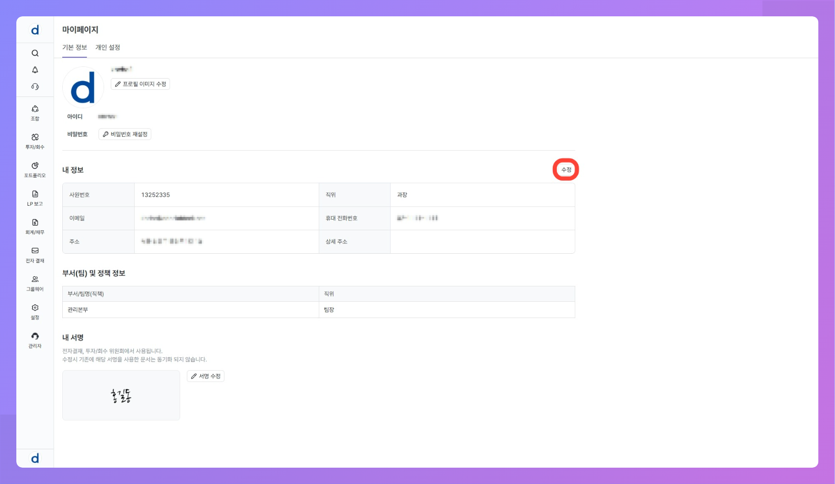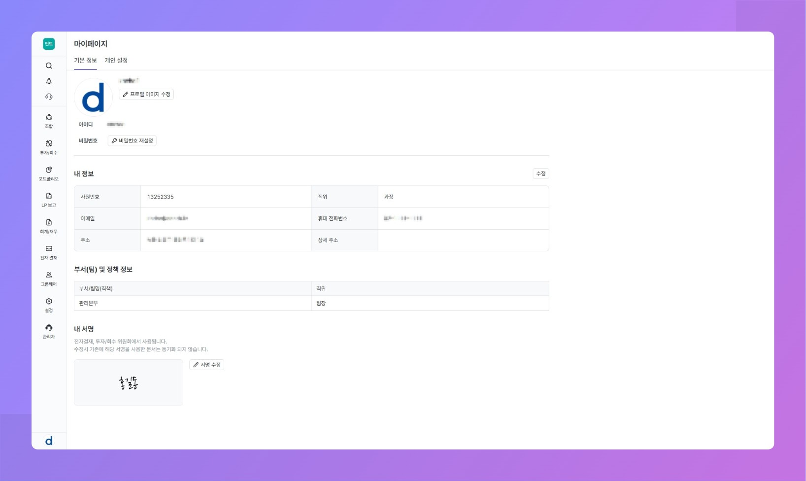 - 내 서명은 전자결재 기안·결재 승인, 투자심의 의견서 제출, 투자 운용지시서의 기안자 서명 등에 재사용됩니다.