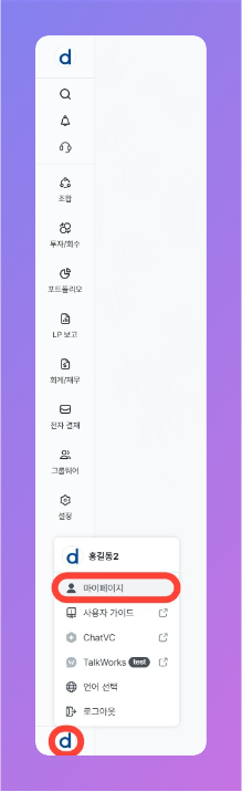 - 마이페이지에 접근하려면 VCworks 화면 좌측 하단의 원형 프로필 아이콘을 클릭한 후