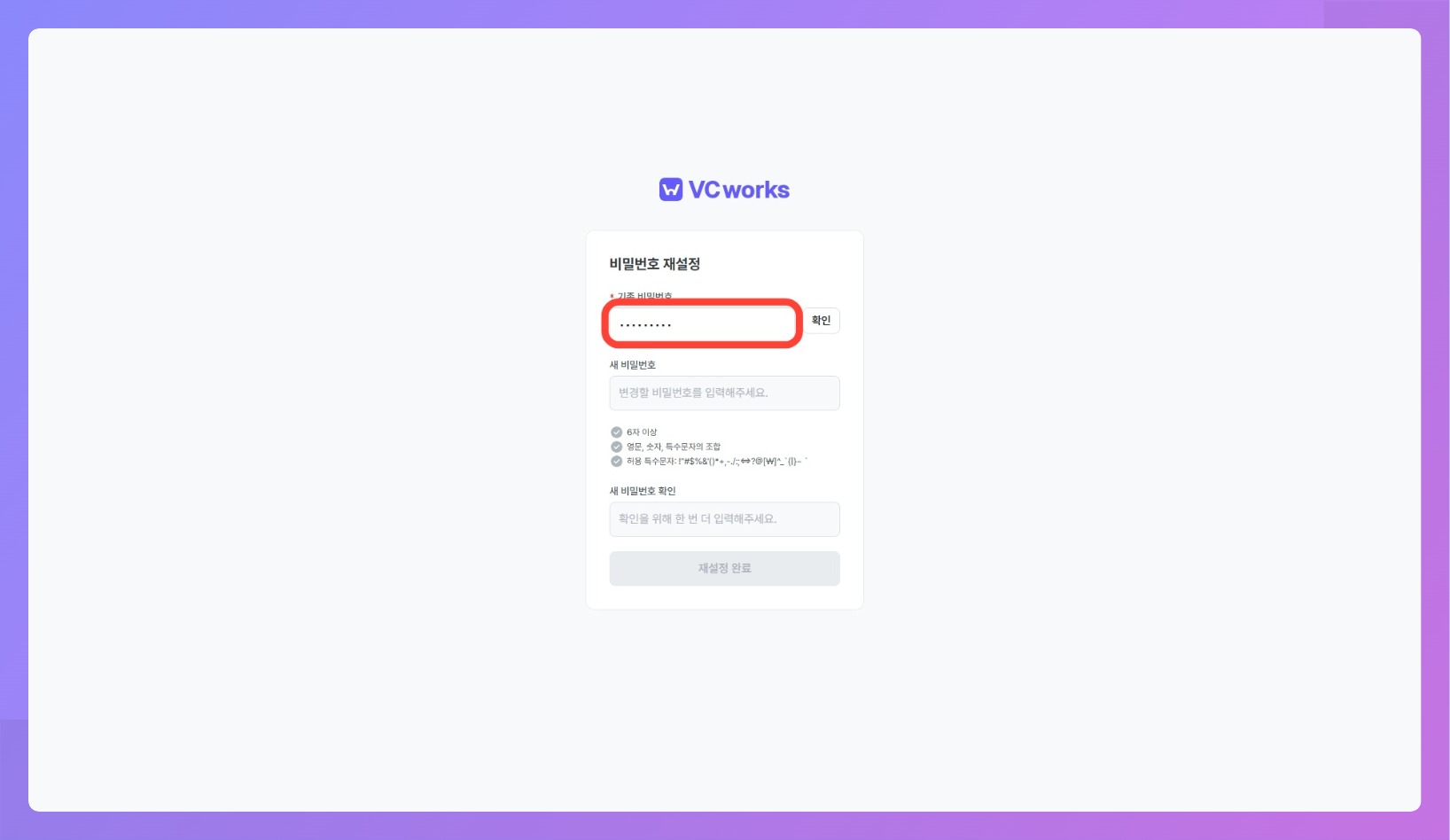 확인버튼을 클릭해주세요.변경할 비밀번호를 입력한 후 [재설정 완료] 버튼을 클릭해주세요.