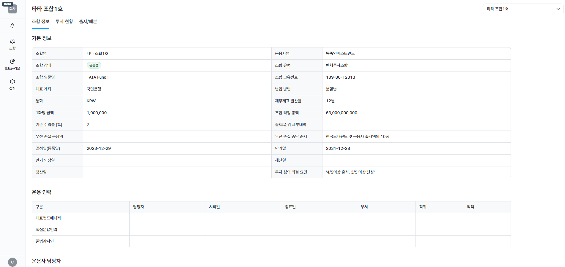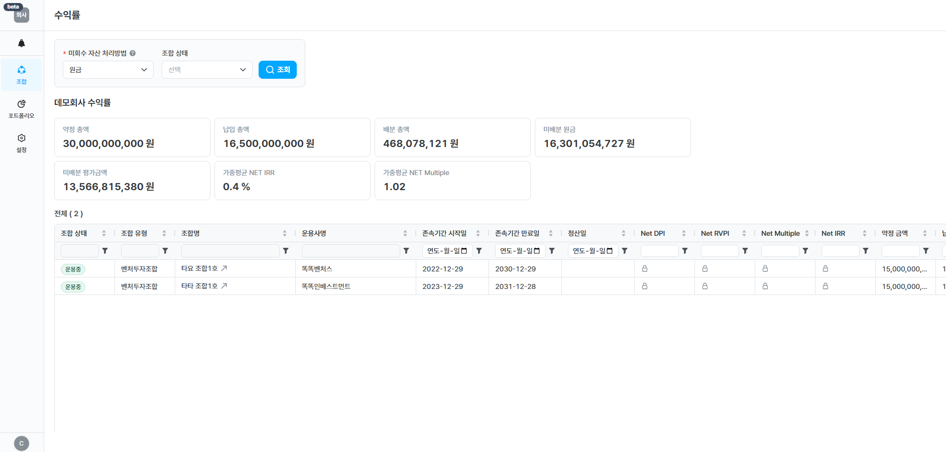 - 수익률: 내 수익률 합계, 조합별 수익률, 운용사별 수익률