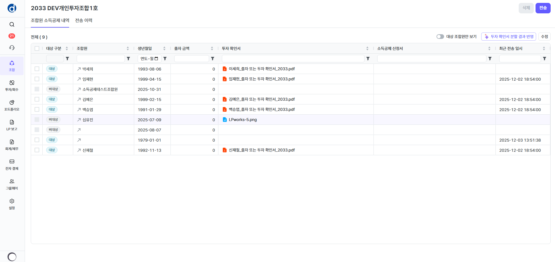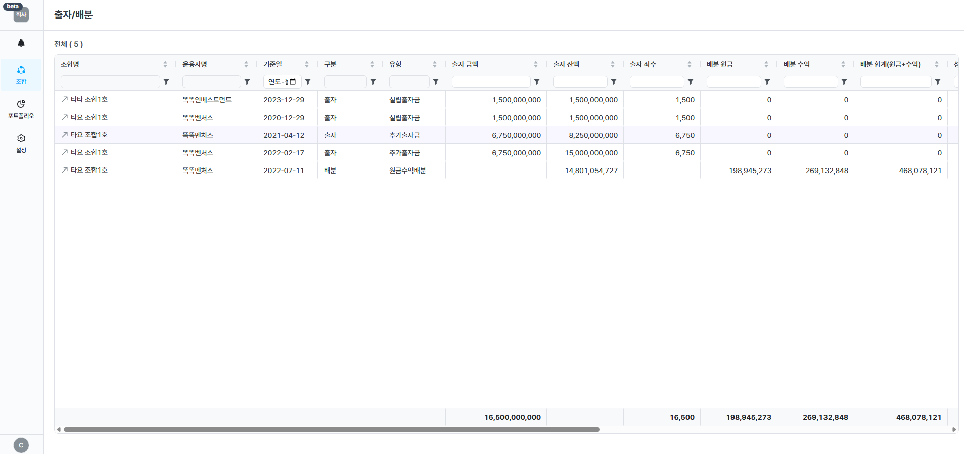 - 출자/배분: 조합원 개인의 출자 및 배분 현황, 회차별 이력 상세