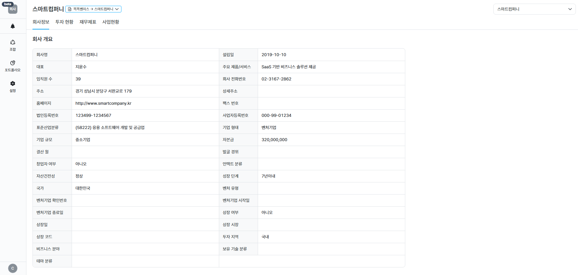 - 포트폴리오: 투자 내역, 재무제표, 사업 진행 현황, 투자 포인트 및 가치평가