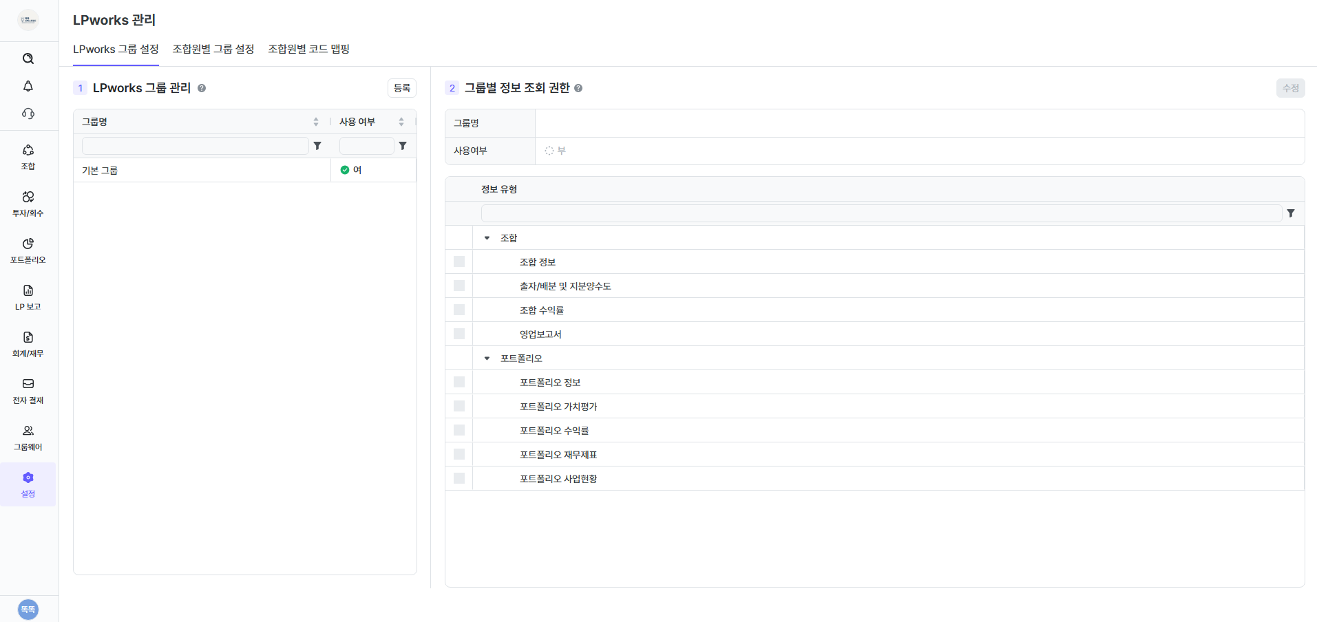 - 권한 설정: 조합원별, 조합별로 조회 권한을 디테일하게 설정할 수 있으며, 동일 권한을 그룹으로 묶어 관리할 수 있습니다.