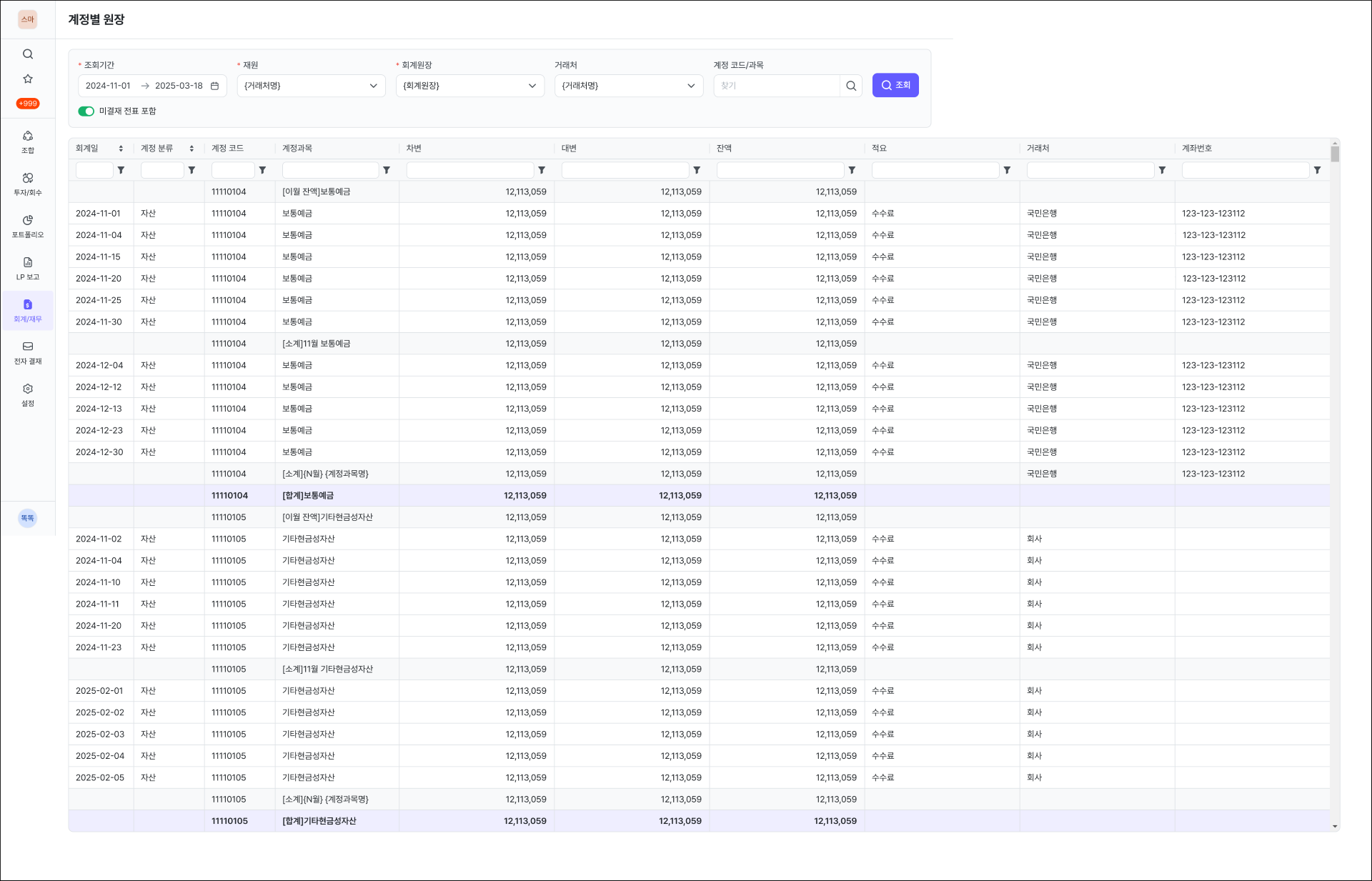 에서 아래와 같이 계정과목의 잔액을 조회할 수 있습니다.- 금융정보관리에 계좌 등록 시 회계 원장 정보가 없어도 계좌 정보를 등록할 수 있게 되었습니다.
