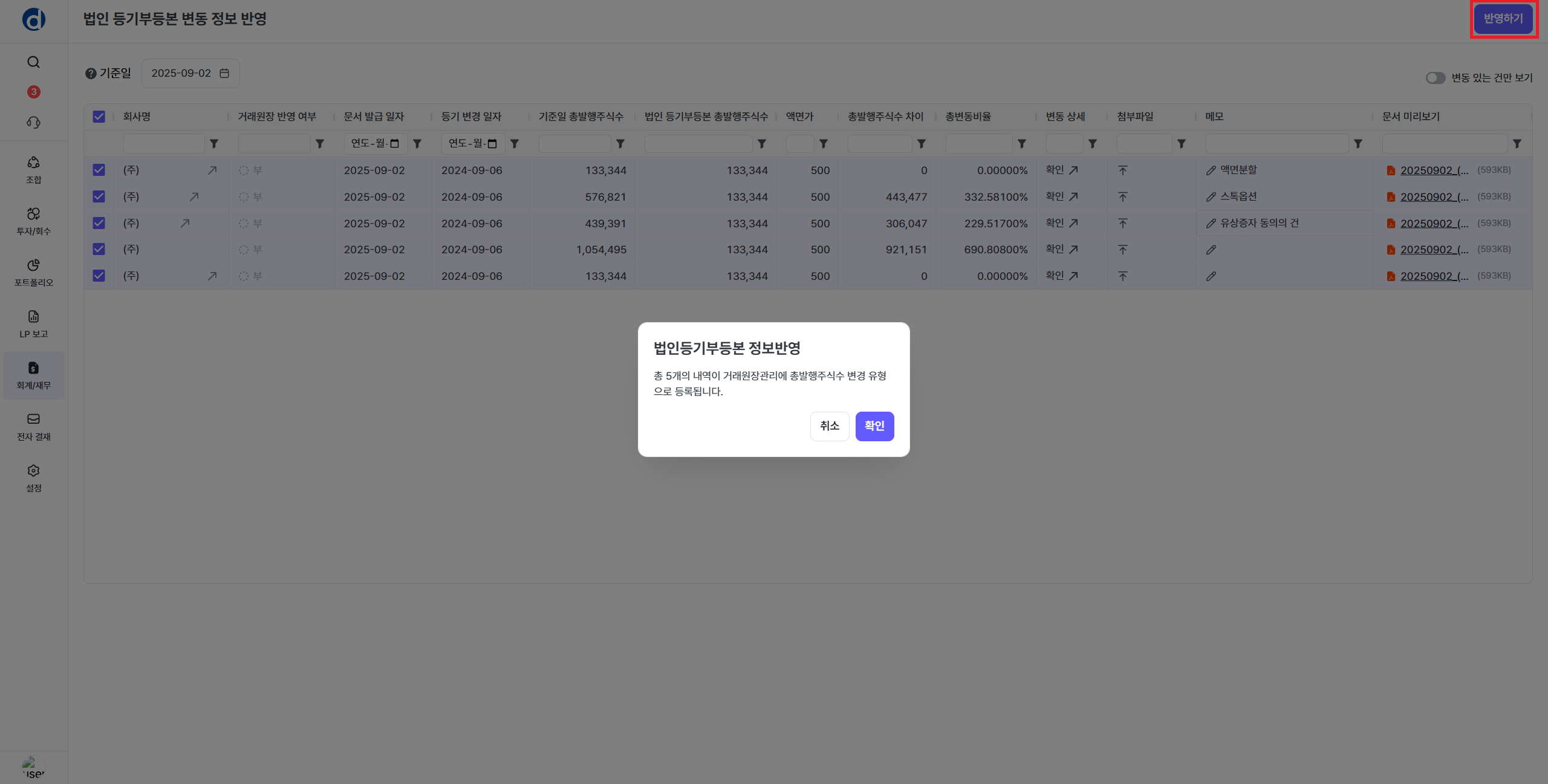 - 법인 등기부 등본을 발급받은 뒤 변동된 정보를 거래 원장 관리 총발행주식수 변경 유형으로 바로 등록할 수 있는 기능이 추가되었습니다.