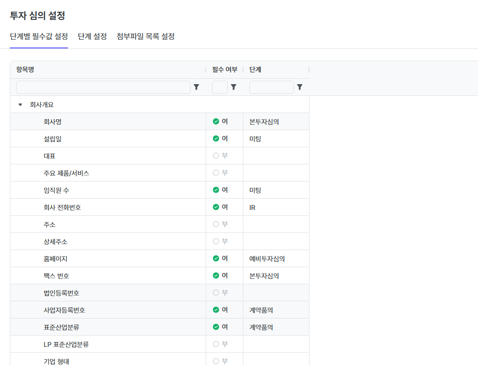 투자/회수 > 투자 심의 설정 > 단계별 필수값 설정