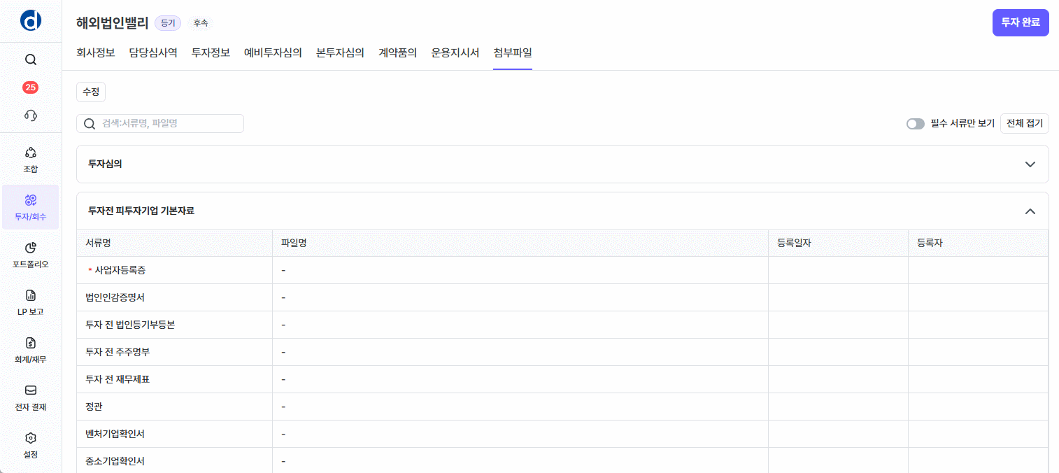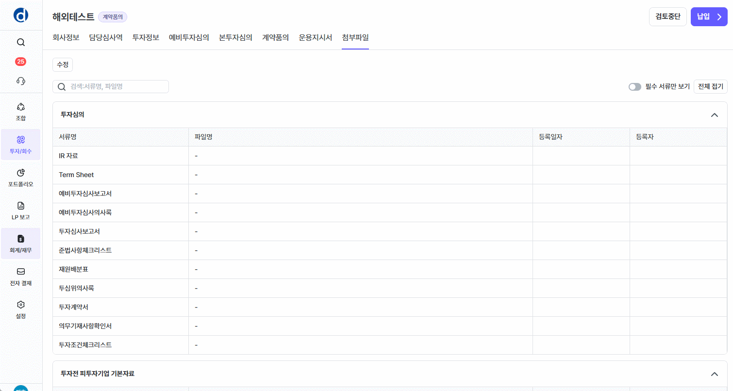 에서 투자 심의 단계별 필수값을 사용자화할 수 있습니다.- 투자 심의 [첨부파일] 탭 UI가 더욱 편리하게 첨부파일을 조회할 수 있도록 개선되었습니다.