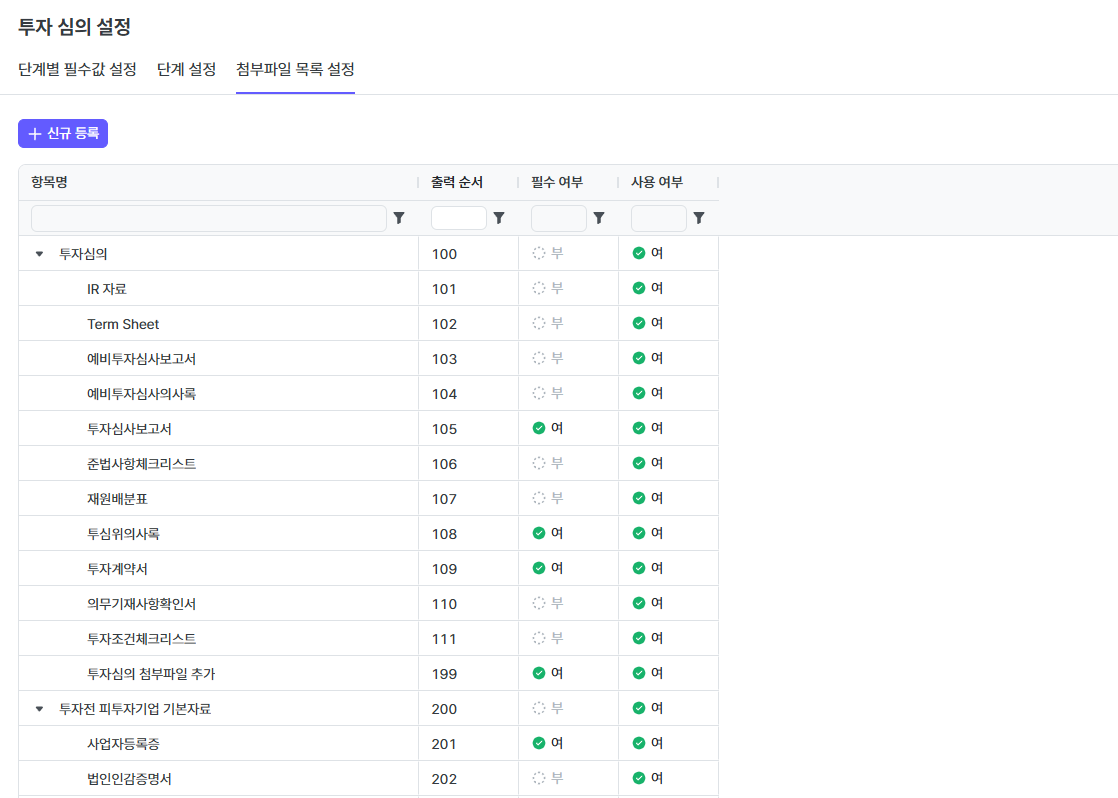 투자/회수 > 투자 심의 설정 > 첨부 파일 목록 설정