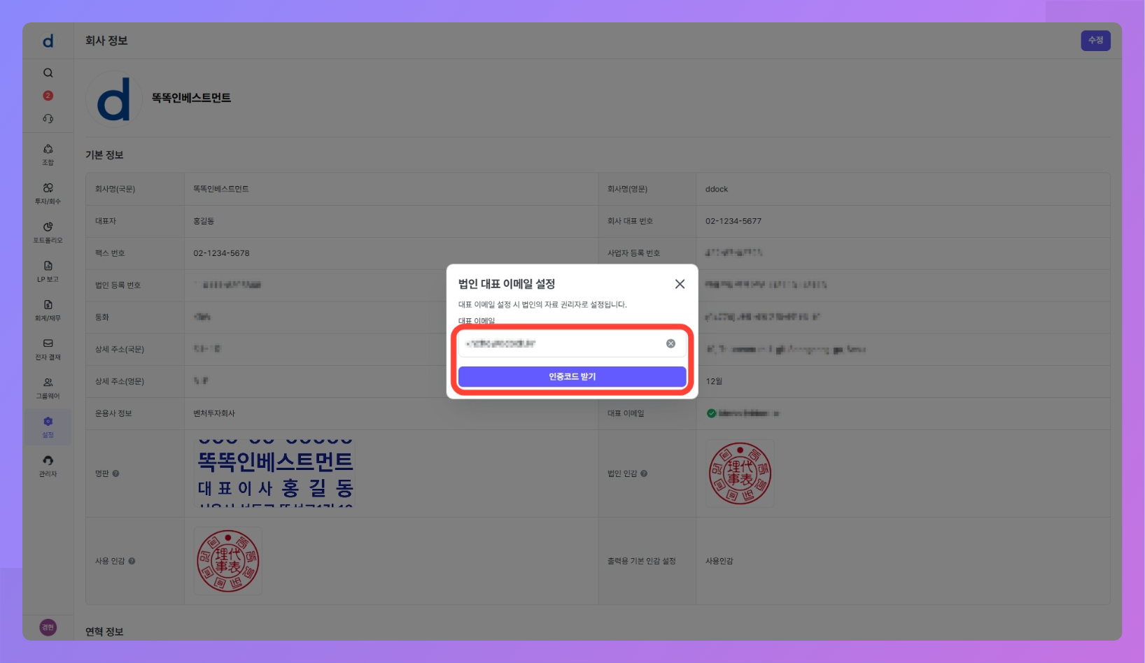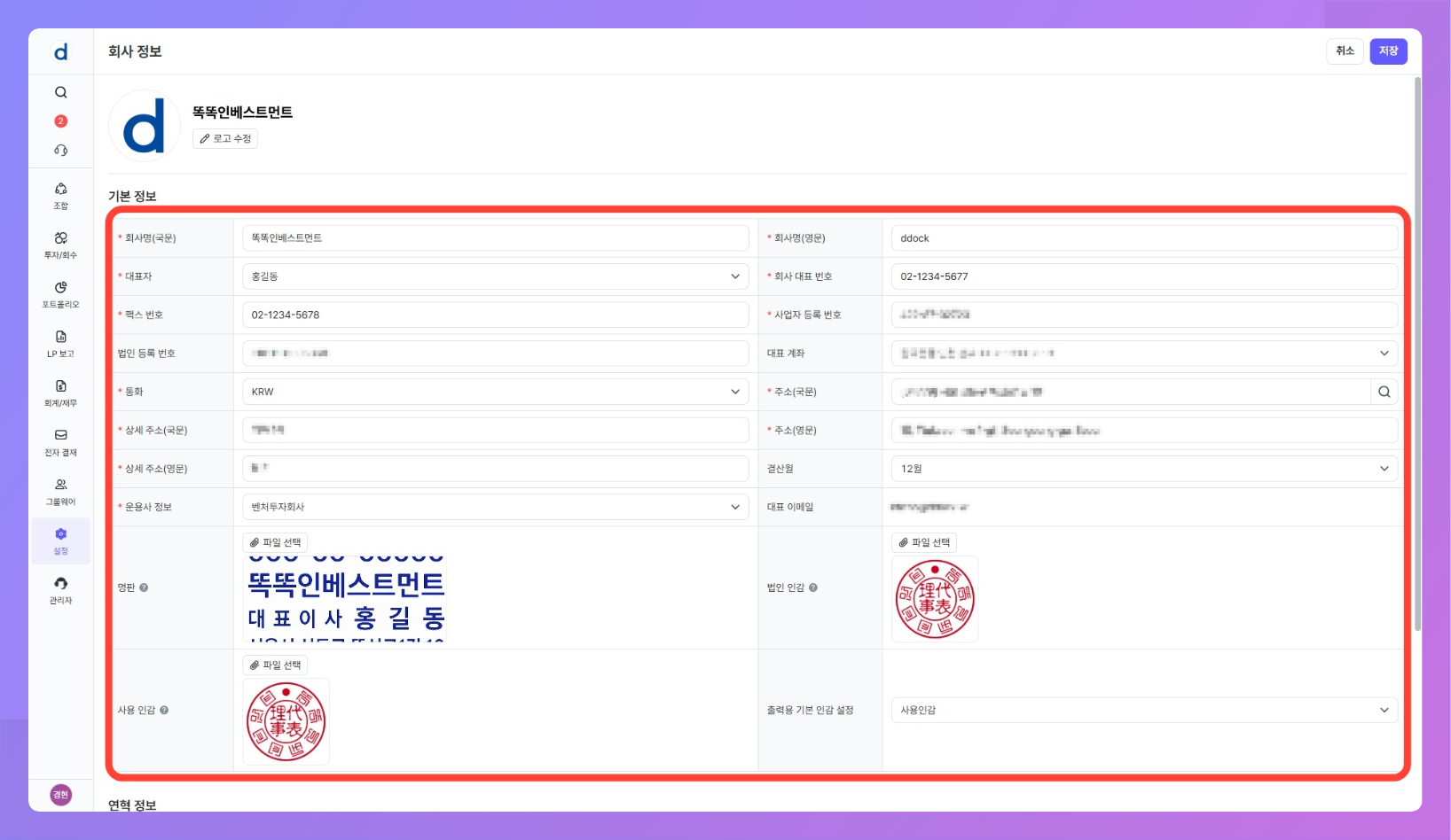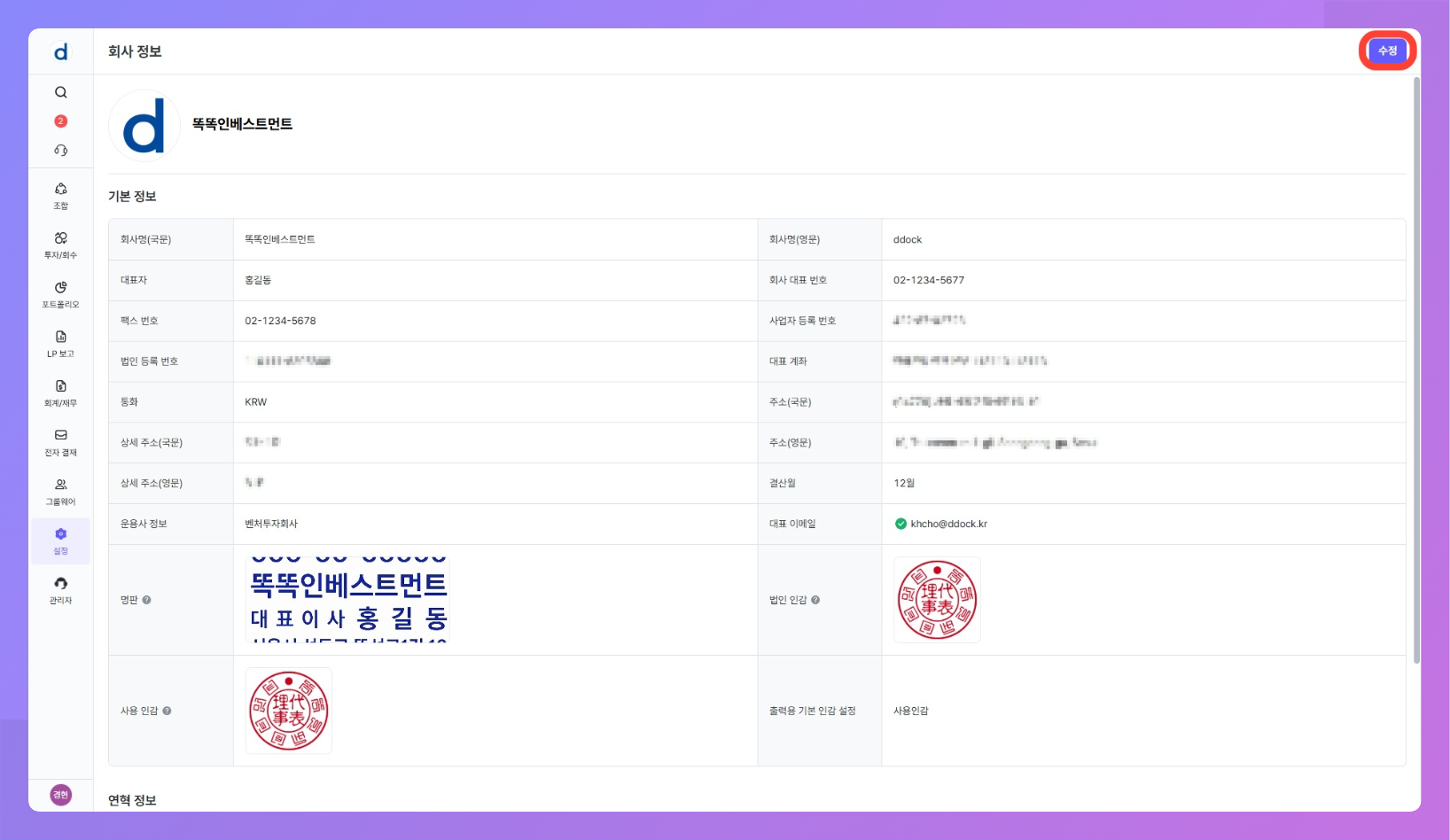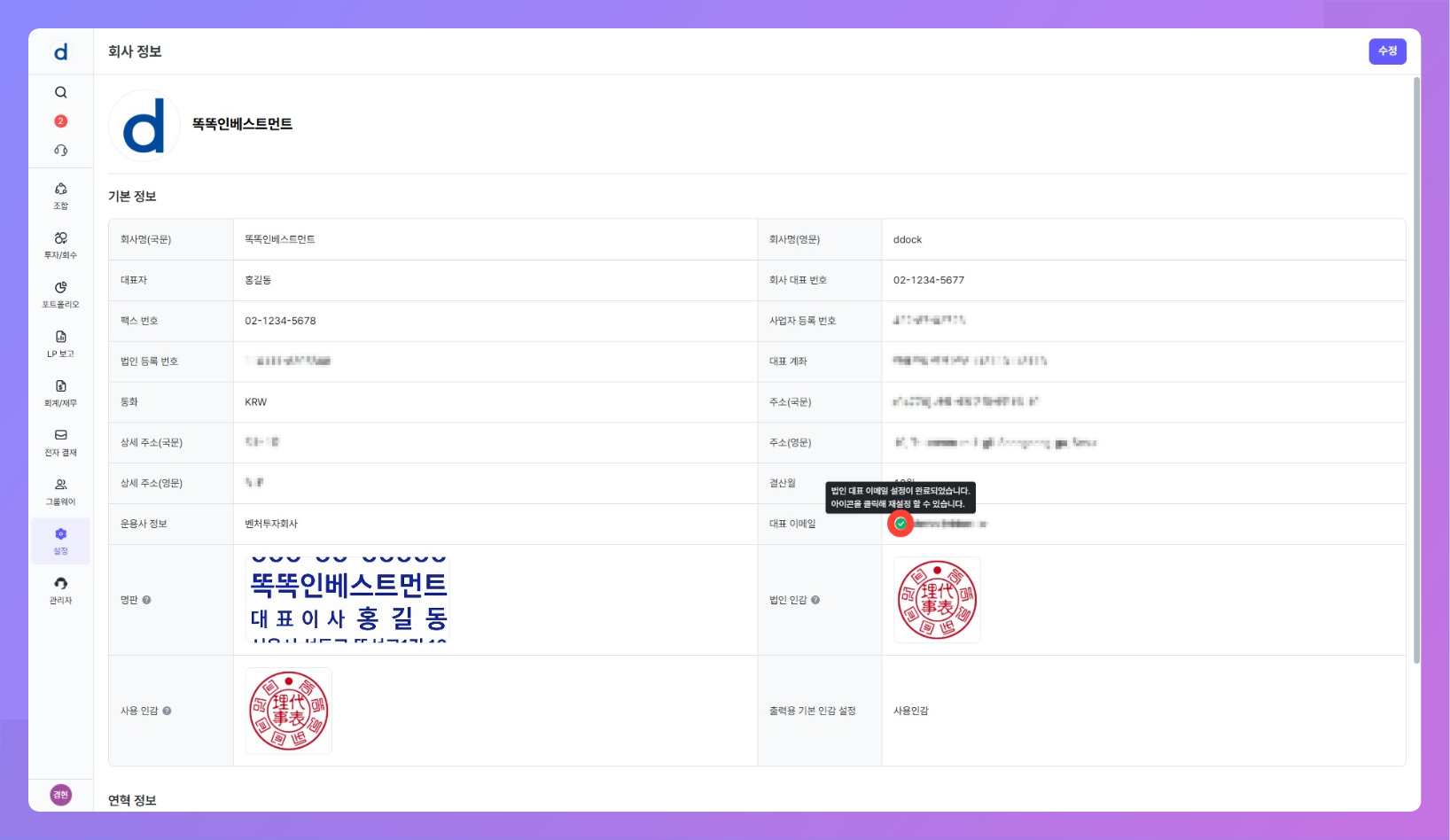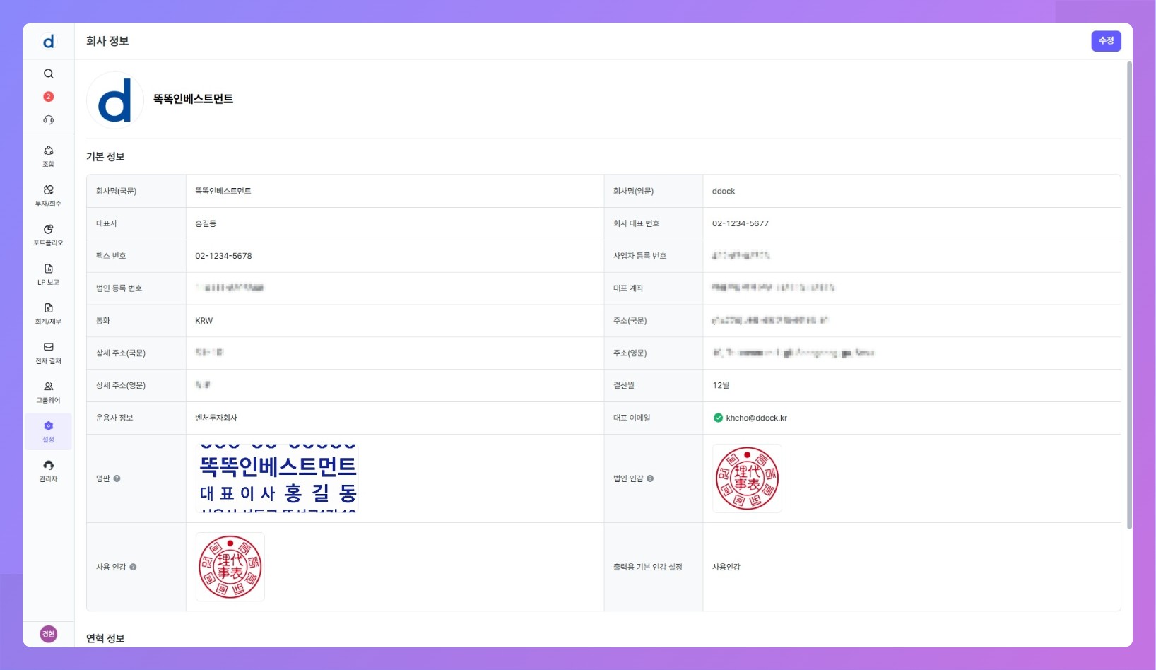 설정 > 회사 정보에서 운용사(법인) 단위의 공통 정보를 관리합니다.- 회사 정보에 등록된 명판과 인감은 재무제표·운용지시서·조합원 명부·출자증서 등 각종 출력물에 활용됩니다.